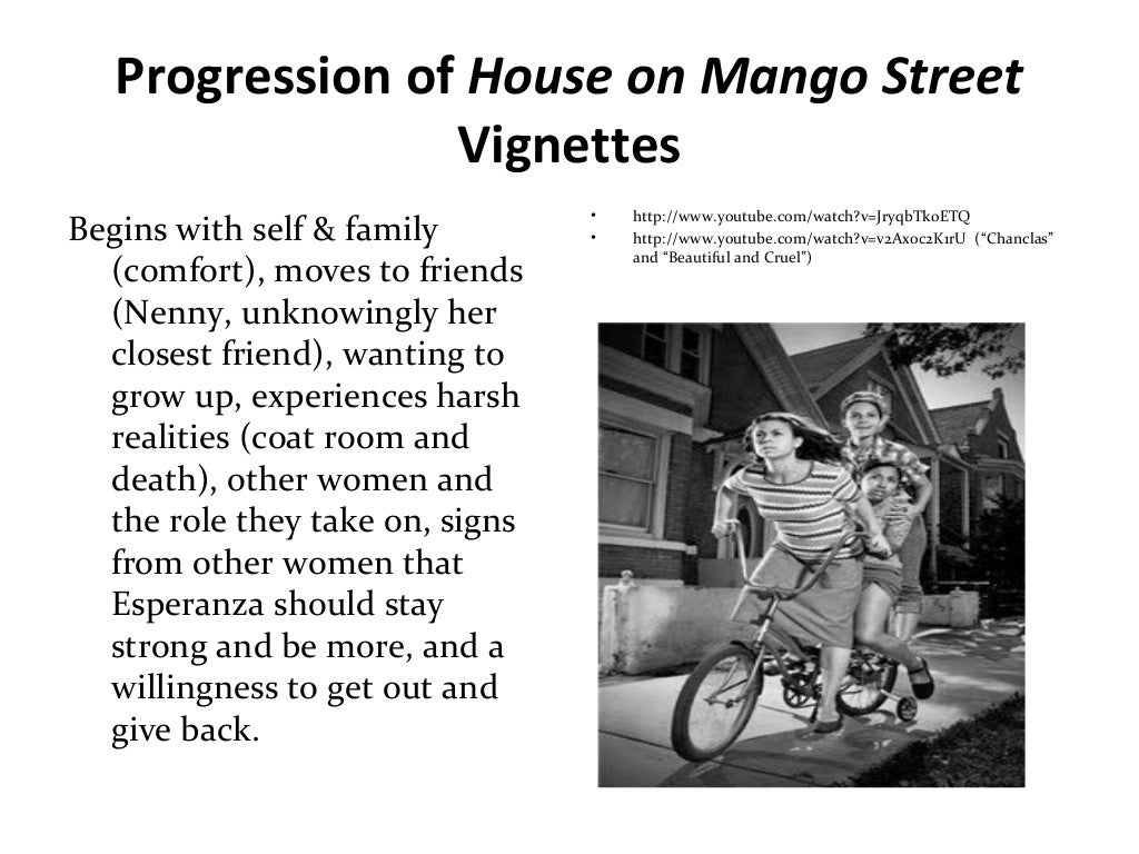 These three, along with Esperanza’s little sister Nenny, have many small adventures in the first part of the book, including searching through a labyrinthine junk store and learning from an older girl named Marin. While exploring her world, Esperanza experiences the shame of poverty, the unfairness of racism, and the beauty of poetry and music. The struggle for self-definition is a common theme in a coming-of-age novel, or bildungsroman, and in The House on Mango Street, Esperanza’s struggle to define herself underscores her every action and encounter.